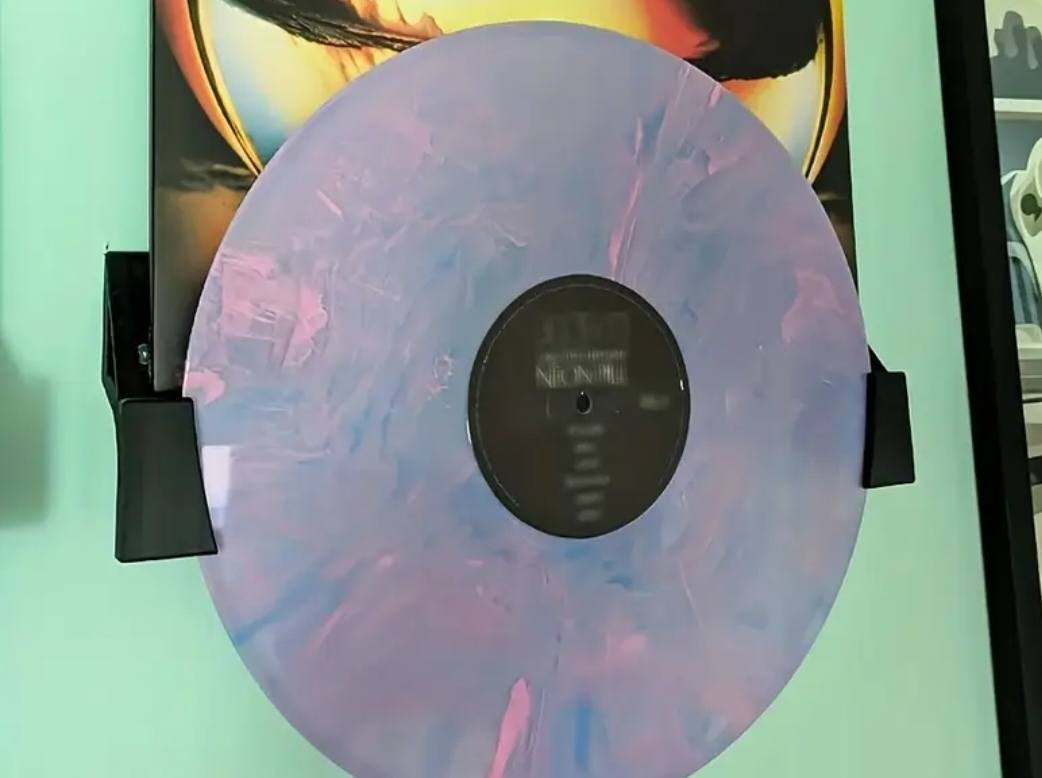 Minimalistische wandhouder voor één LP met hoes, ideaal om je mooiste vinylhoes én plaat tegelijk te presenteren. Perfect voor gekleurde vinylplaten en bijzondere artwork, zoals te zien op de voorbeeldopstelling.