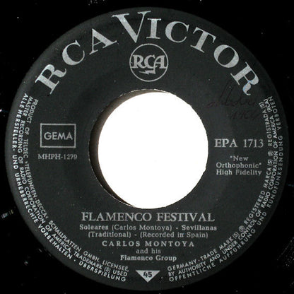Back cover and center labels mention: "Carlos Montoya and his Flamenco Group" Liner notes back cover: ยฉ by Radio Corporation of America, 1958 / Recorded in Spain. A2, B1 and B2 are traditionals.
