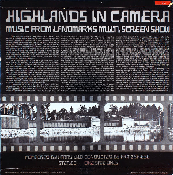 From sleeve notes: 'The musical score of "Highlands In Camera", produced in collaboration by Harry Wild and Fritz Spiegl, was commissioned by Landmark as a sound track to a multi screen show examining the impact of man on the Highlands. No spoken commentary is used. The music has the dual function of heightening the emotional enjoyment of the photography and of helping to lead the ear towards what the changing sequence of pictures is trying to say. Most of it is a conscious pastiche of the music associated with the periods depicted, or else conveys the atmosphere suggested by the earliest times, before man was able to formulate his musical thoughts.' Copyright: Landmark Carrbridge Inverness-shire. Produced By Electrosonic Ltd., Greenwich, England. Sleeve designed by Forth Studios and printed in Scotland by Warwick & Sons Ltd. Textured labels, flipback sleeve.