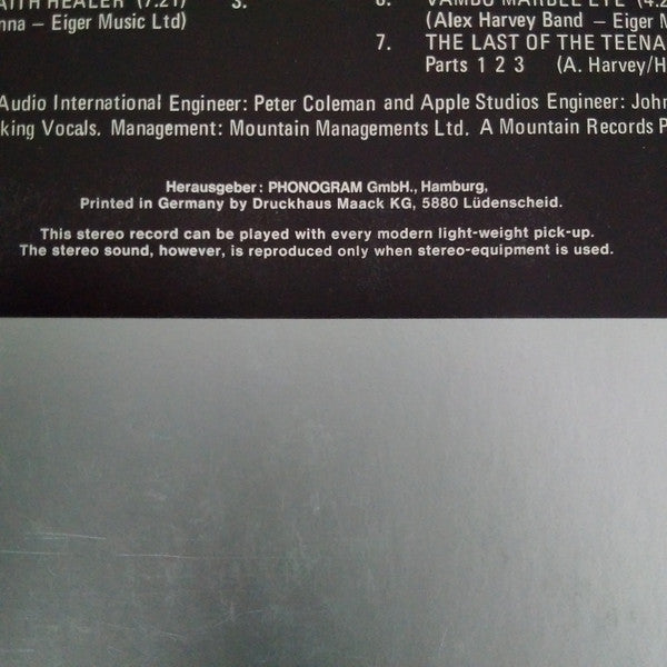 1977 repress of [r3507697. Silver metallic look printed sleeve (no PRS, no Label Code) Later reissued sleeves have a darker, grey look Recorded and mixed at: Audio International and Apple Studios Management: Mountain Managements Ltd. A Mountain Records Production. Published by: Eiger Music Ltd (tracks A1 to A3, B3, B4) Kassner Music Ltd (track B1) Carlin Music (track B2) Herausgeber: PHONOGRAM GmbH., Hamburg. Printed in Germany by Druckhaus Maack KG, 5880 Lรผdenscheid Tracks are sequentially numbered 1 to 7 on back cover Release date derived from inner sleeve printings The runout strings are stamped, the last two digits (variant 2) are sideways arranged