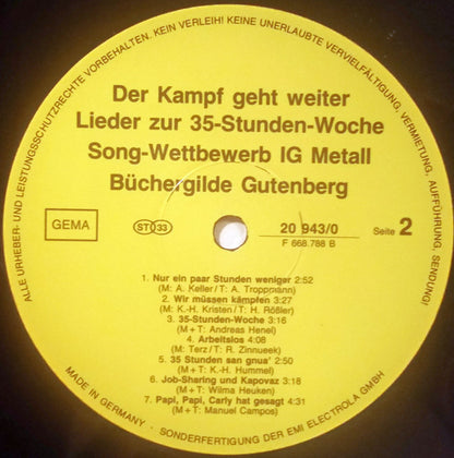 Lieder zur 35-Stunden-Woche. Song-Wettbewerb der IG Metall. Live-Aufnahme der Entausscheidung vom 24. Mai 1984 im IGM-Bildungszentrum Sprockhövel.