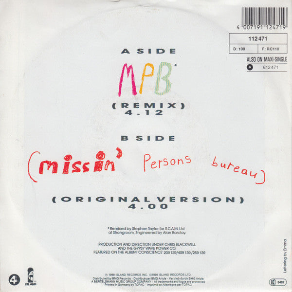 โ 1988 Island Records Inc. ยฉ 1989 Island Records Ltd. Lettering by Emma FEATURED ON THE ALBUM 'CONSCIENCE' 209 139/409 139 /259 139 Remixed [... for S.C.A.M. Ltd.